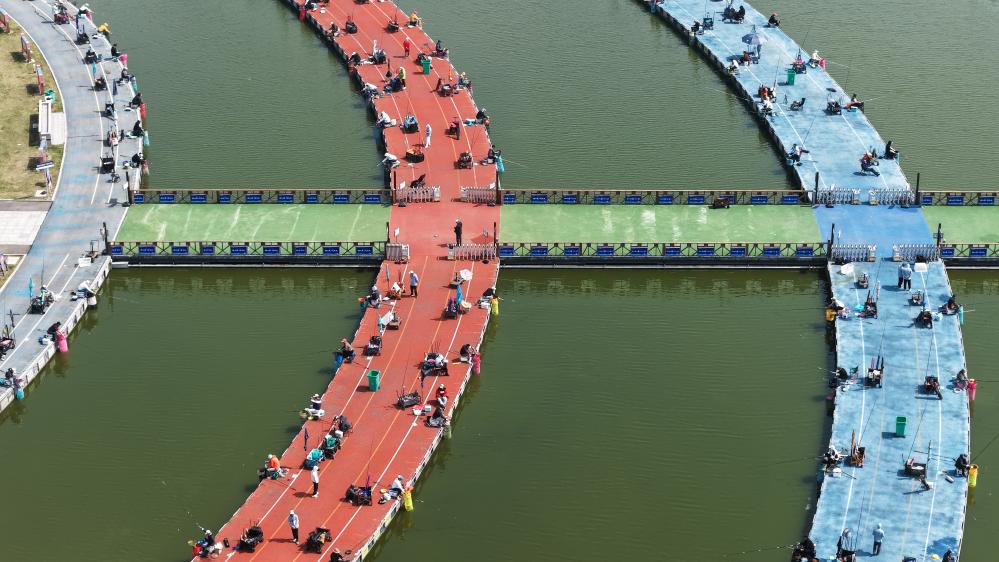 4月4日,垂钓爱好者在江苏省泗洪洪泽湖国际垂钓中心大圆塘参加钓鱼比赛(无人机照片)。