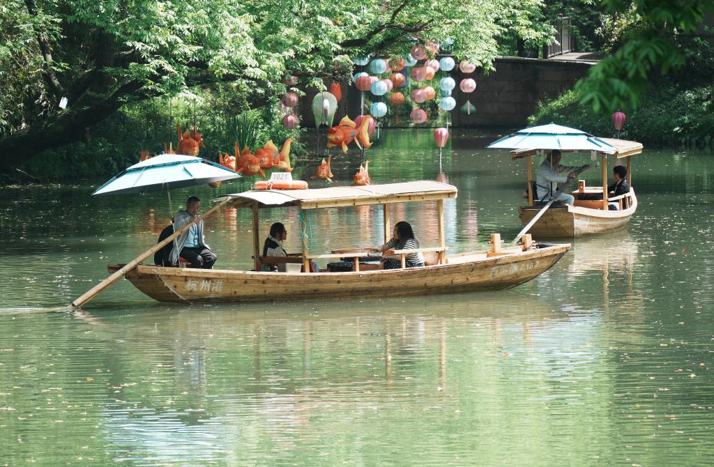 4月5日,游客乘船游览杭州西溪国家湿地公园。