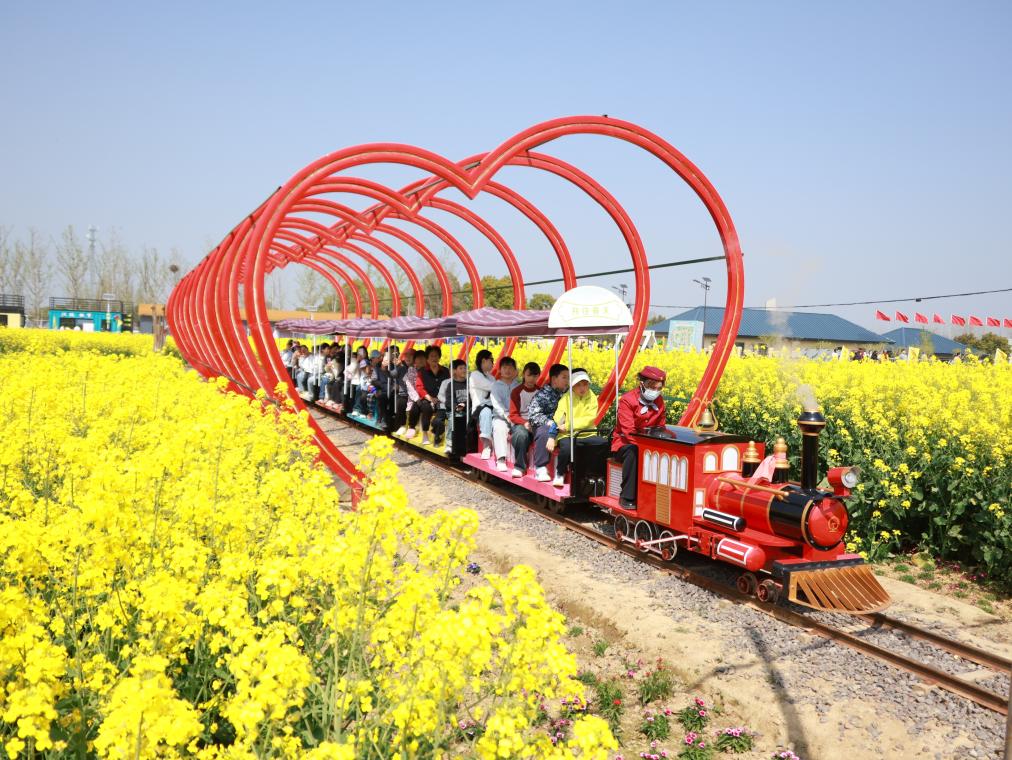 4月4日,游客在江苏省盱眙县黄花塘镇向阳花海乘坐小火车游玩。