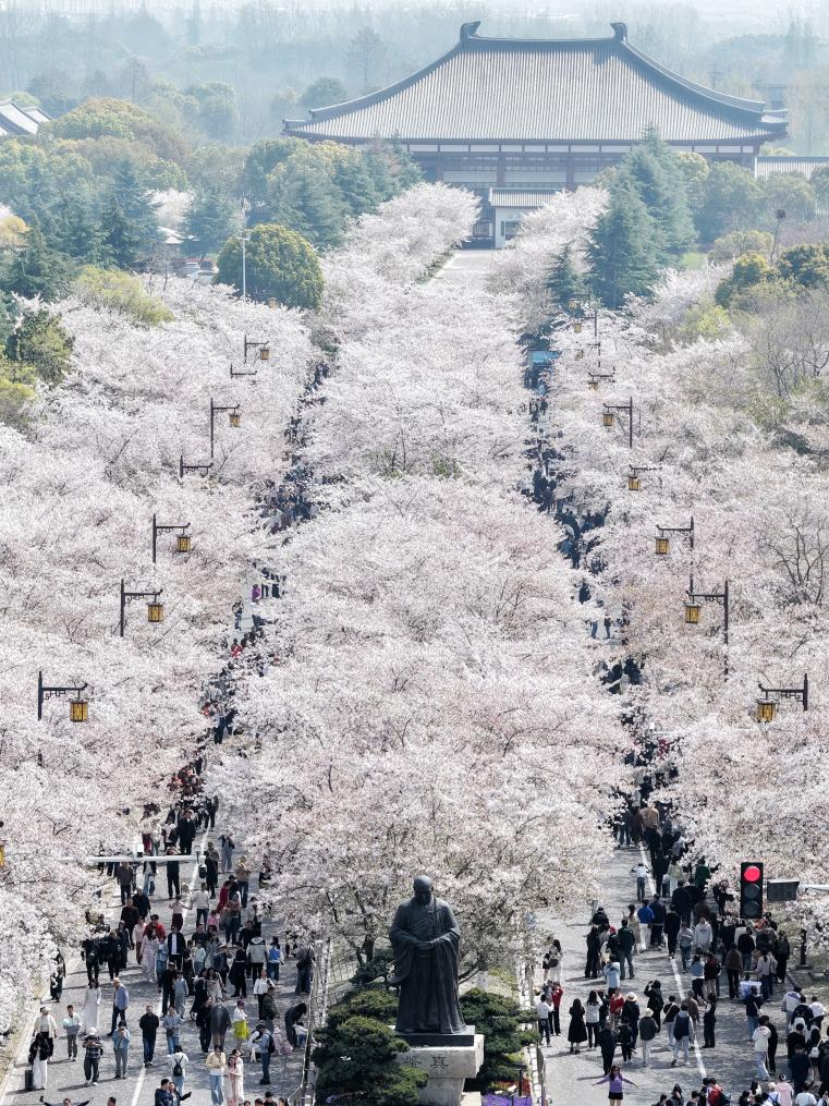 4月4日,游客在江苏省扬州市鉴真路上的“樱花大道”赏花游玩(无人机照片)。