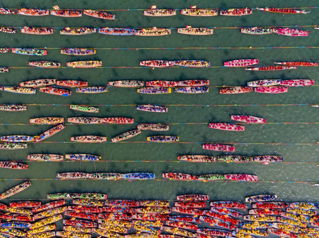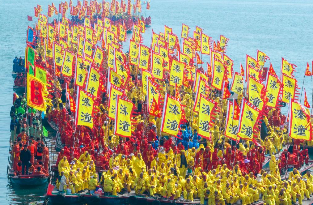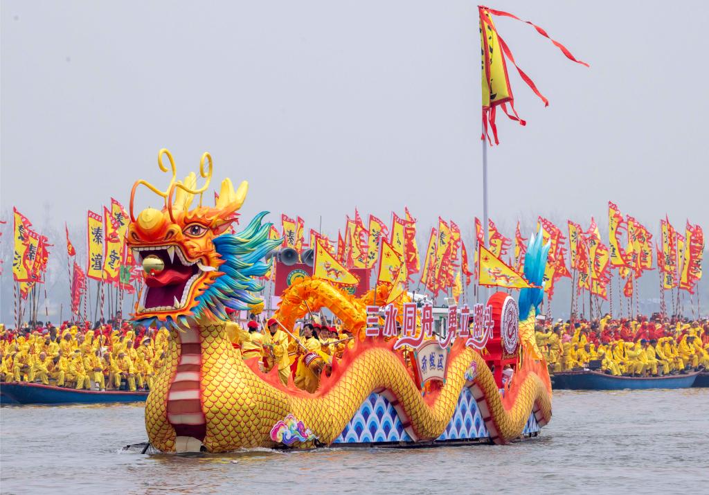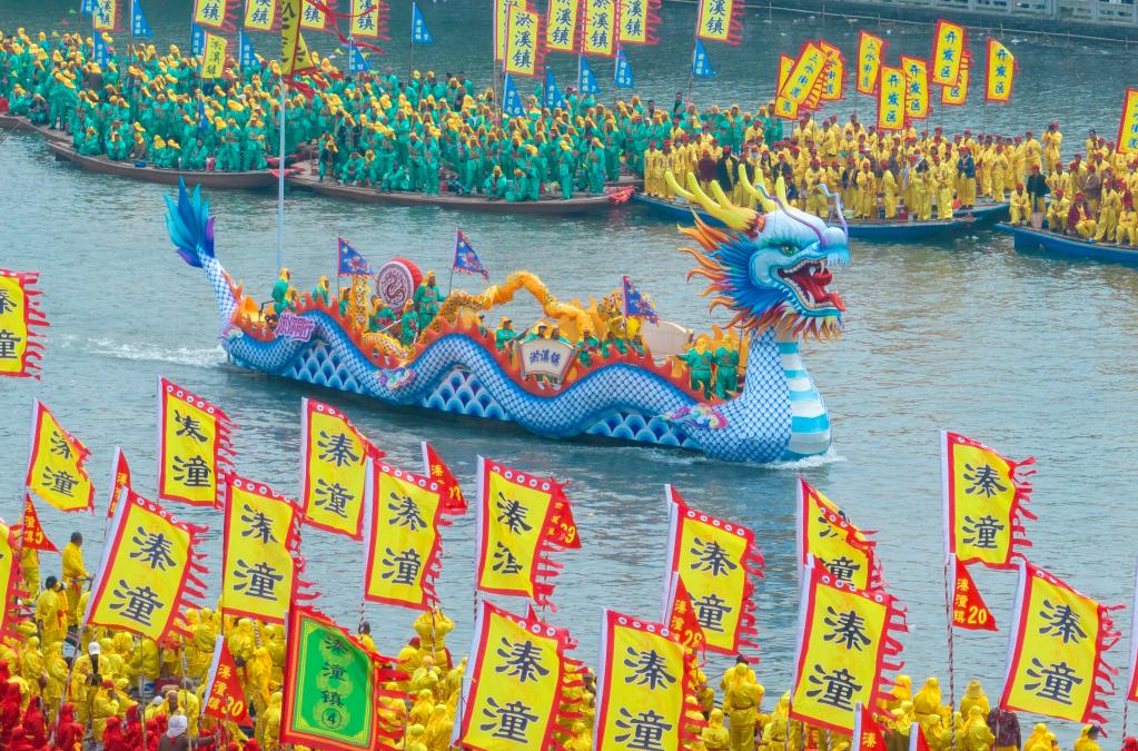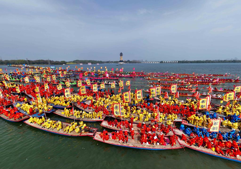 4月6日,2026年泰州姜堰溱潼会船节在江苏省泰州市姜堰区溱湖国家湿地公园开幕,数百条各式船只和上万名会船选手飞篙走桨,奋勇争先,演绎历久弥新的民俗画卷。