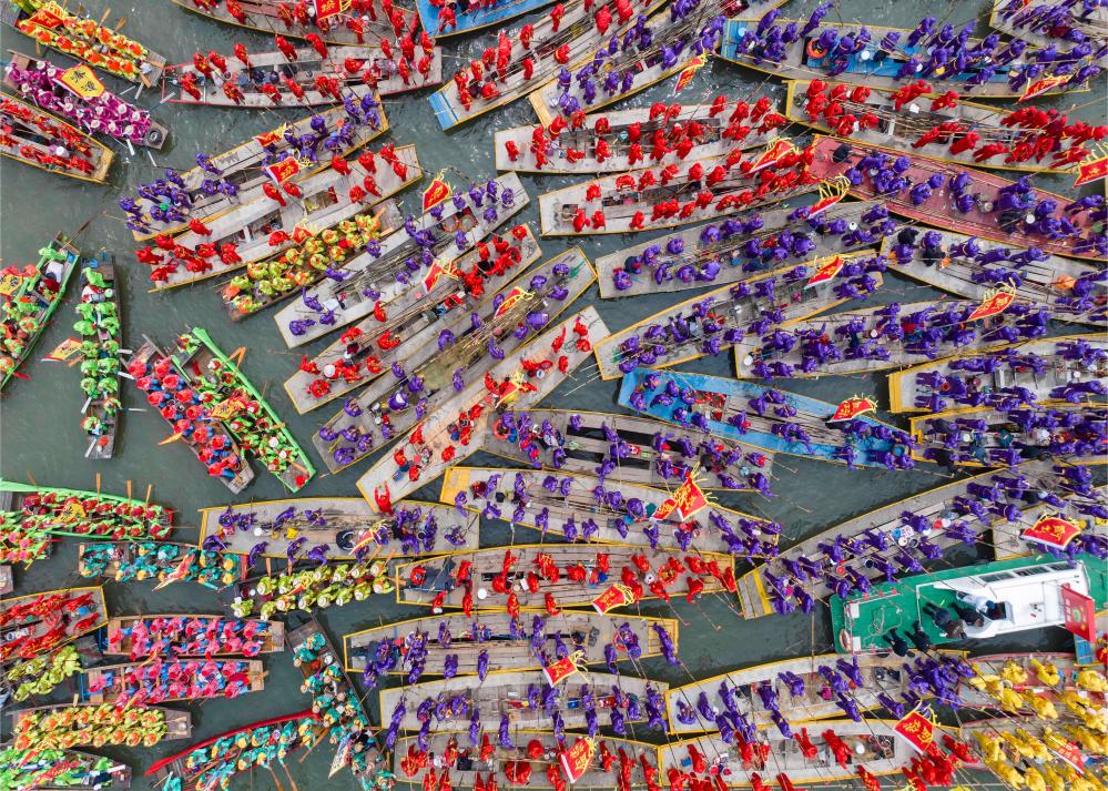 4月6日,参加会船表演的船只云集溱湖(无人机照片)。