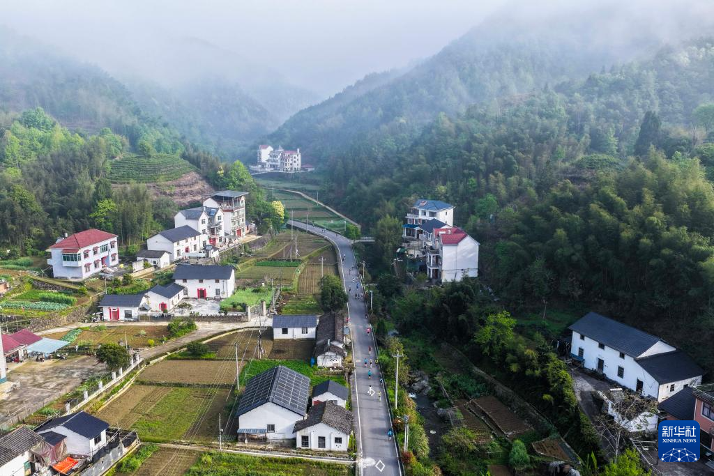 4月19日,选手们奔跑在乡村田野间(无人机照片)。