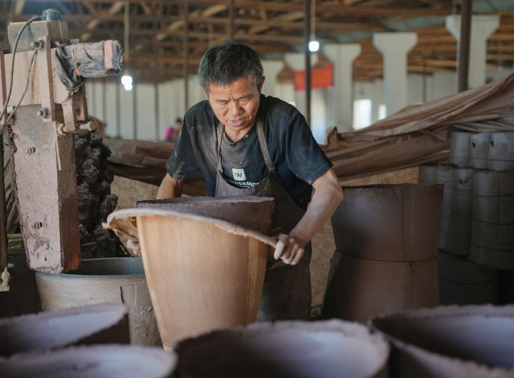 以上图片:2026年4月19日,在浙江省湖州市长兴县小浦镇高地村,工人在一处作坊内制作陶器。CICPHOTO/陈海伟 摄