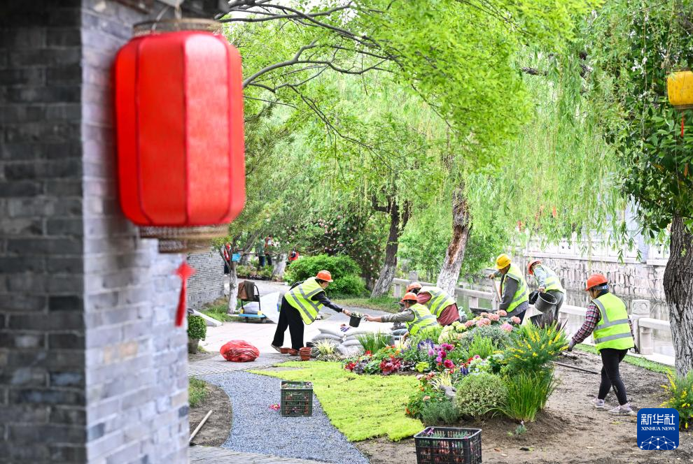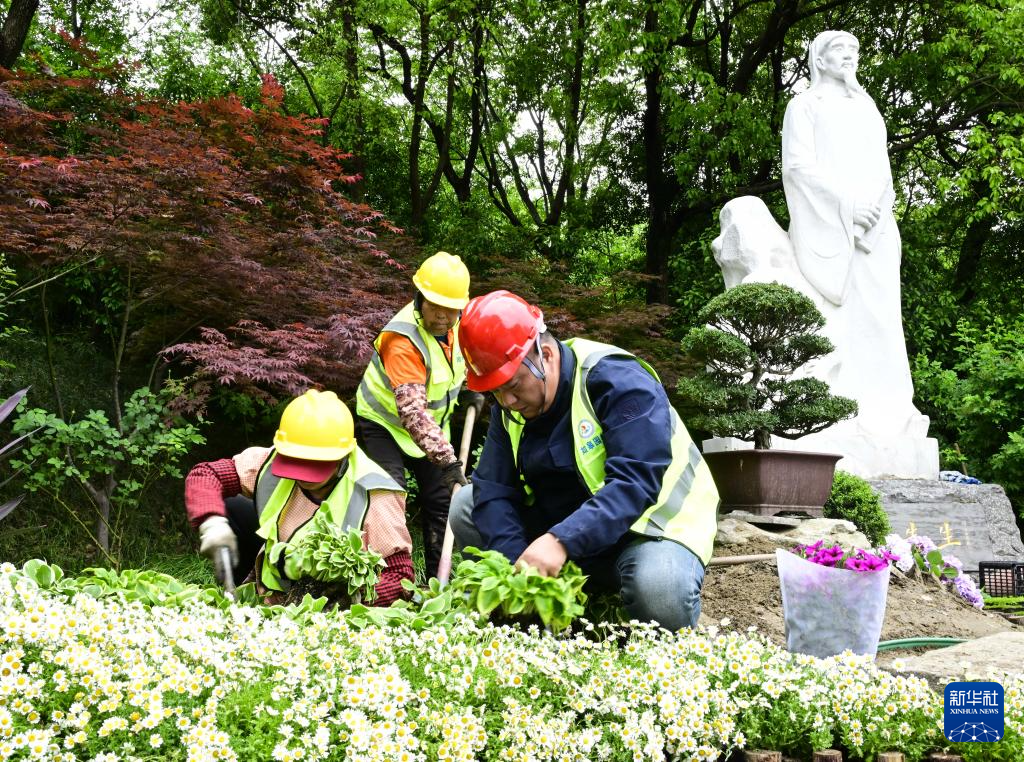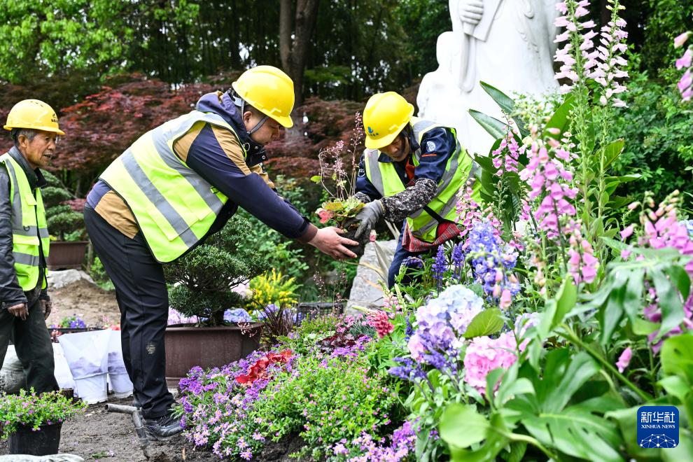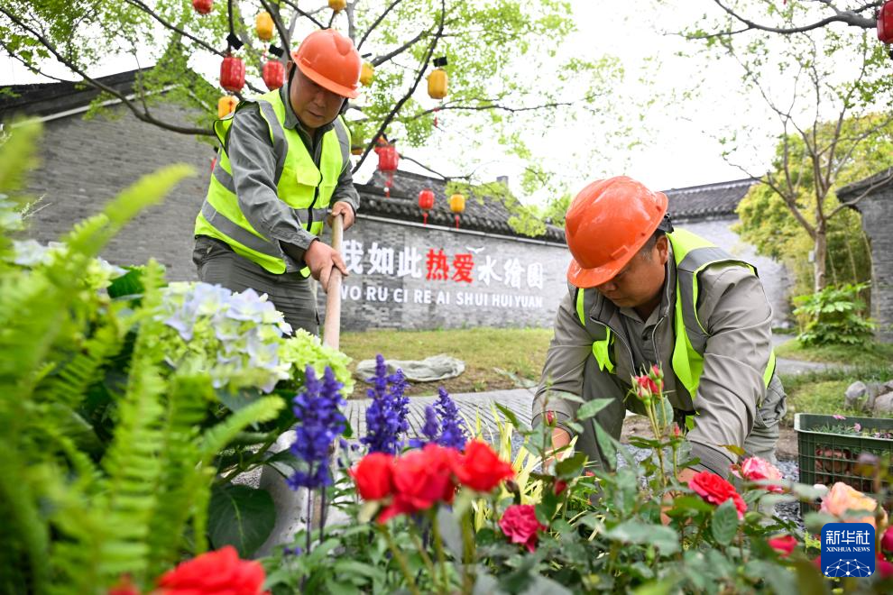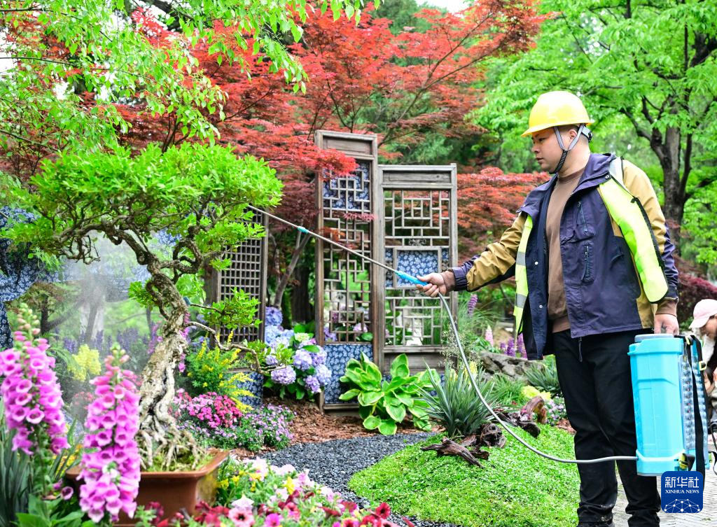 4月28日,在如皋水绘园风景区,参赛人员给花境作品喷水。