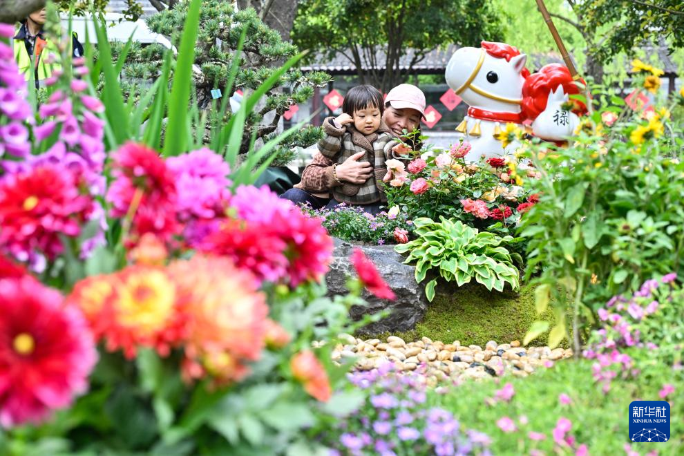 4月28日,市民在如皋水绘园风景区欣赏花境作品。