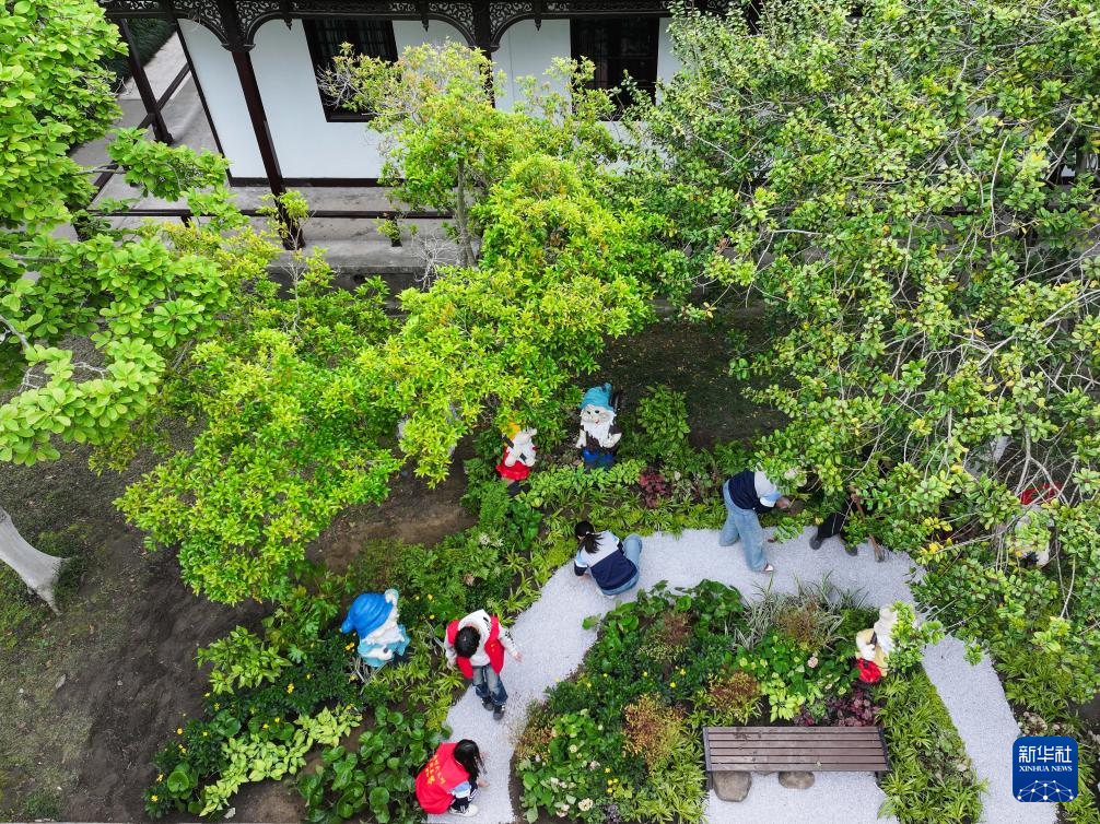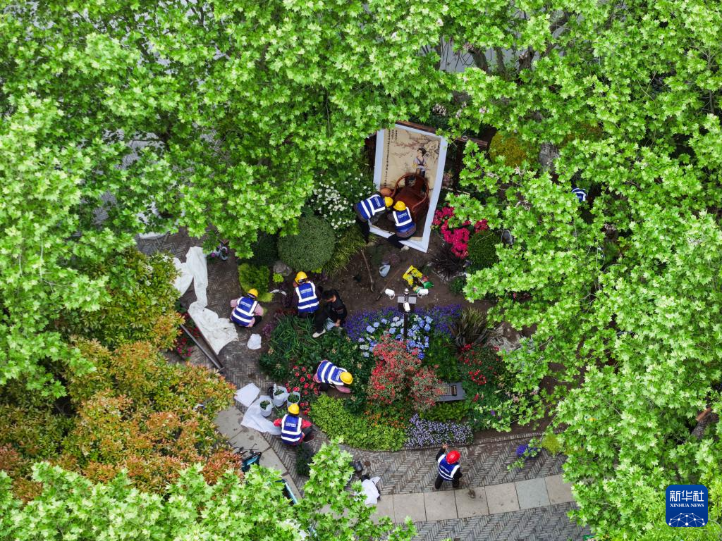 4月28日,参赛队伍在如皋水绘园风景区营造花境作品(无人机照片)。